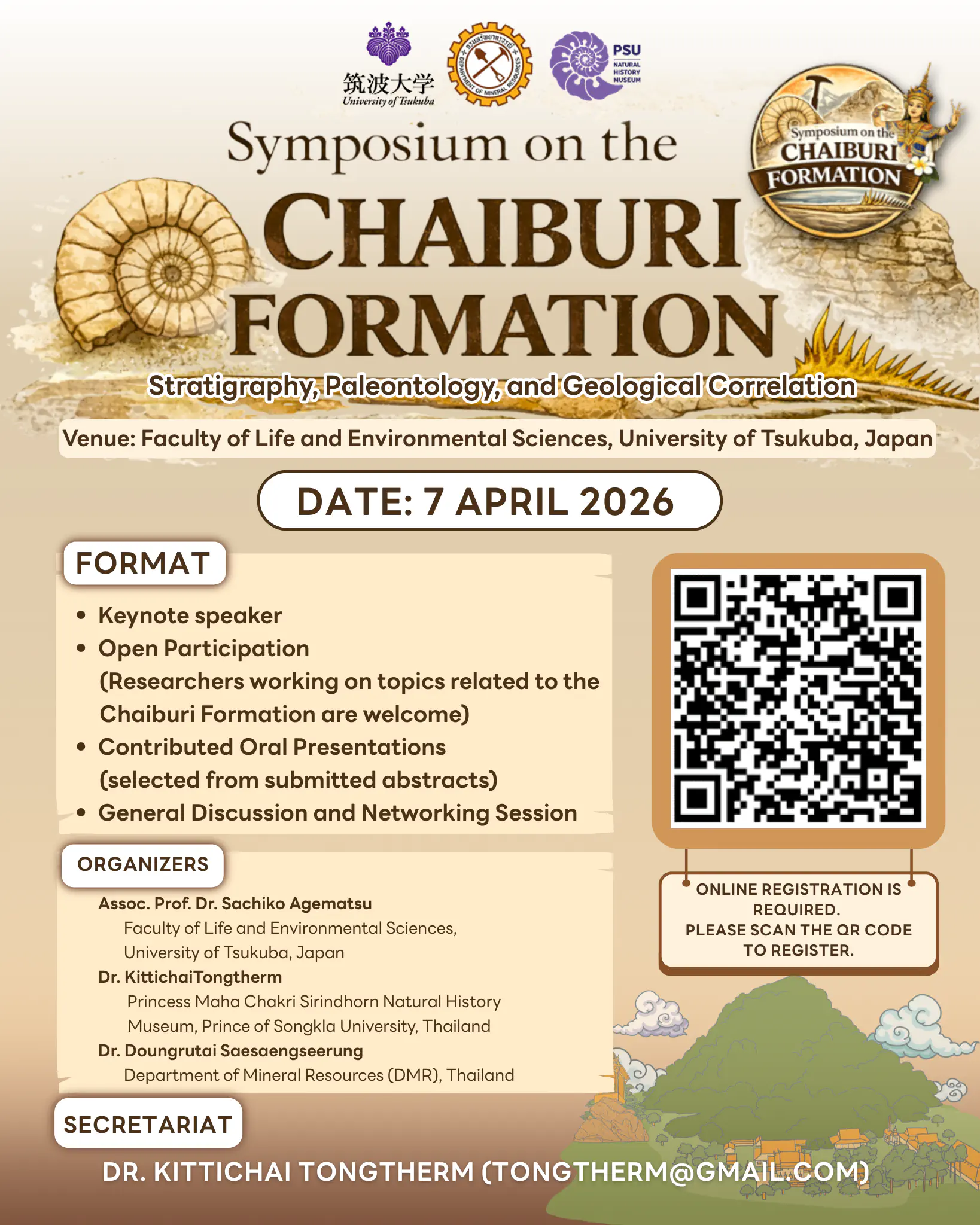 The organizing committee is pleased to invite researchers, academics, and graduate students to participate in the Symposium on the Chaiburi Formation: Stratigraphy, Paleontology, and Geological Correlation, to be held on 7 April 2026 at the Faculty of Life and Environmental Sciences, University of Tsukuba, Japan.